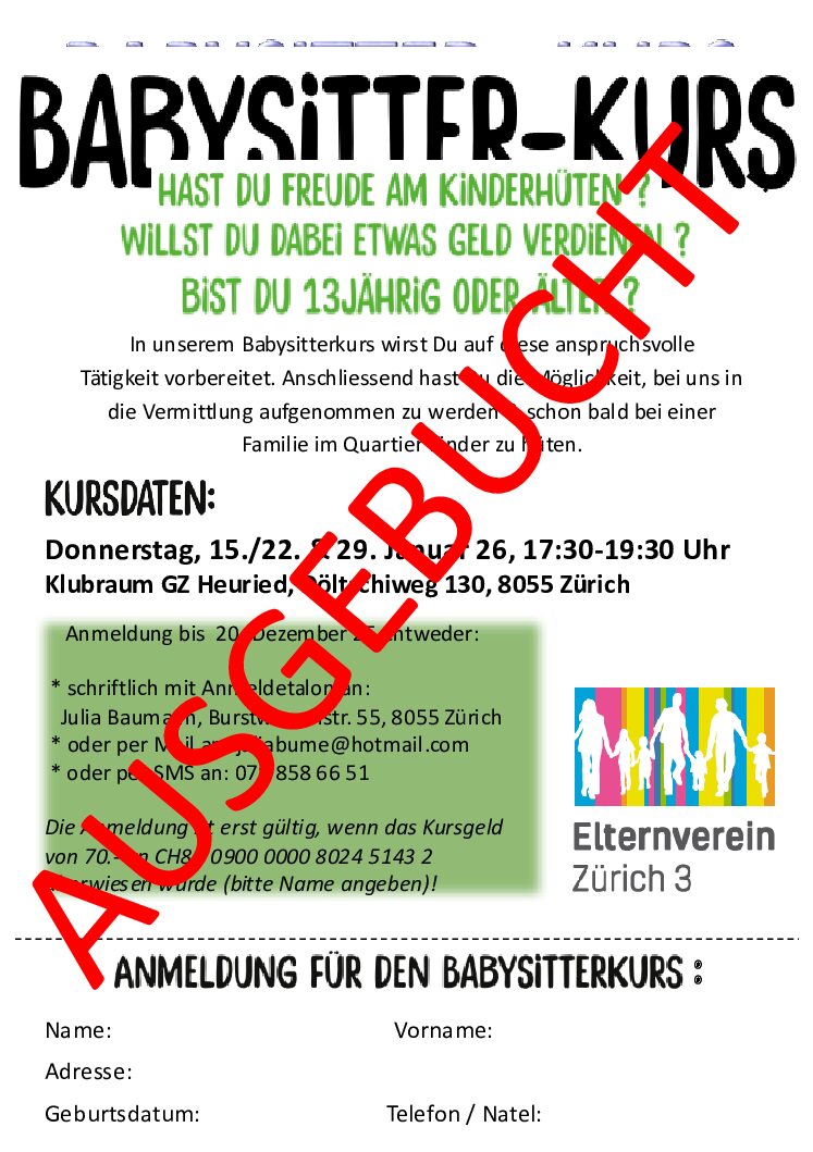 Im Babysitter-Kurs lernst du die wichtigsten Grundlagen fürs Babysitten kennen. Der Kurs wird von einer erfahrenen Kinderkrankenschwester geführt und findet, je nach Anzahl Anmeldungen, ein bis zwei Mal pro Jahr statt (3 Abende à 2 Stunden). Die Kursdaten werden hier veröffentlicht. Du kannst dich auch jederzeit bei uns melden, falls du Fragen hast.